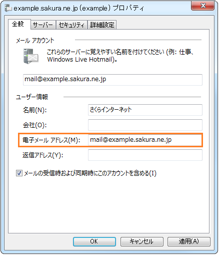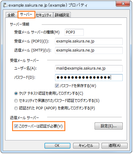 例)mail@example.sakura.ne.jpパスワード 設定する(利用する)メールアドレスのパスワードを入力します。