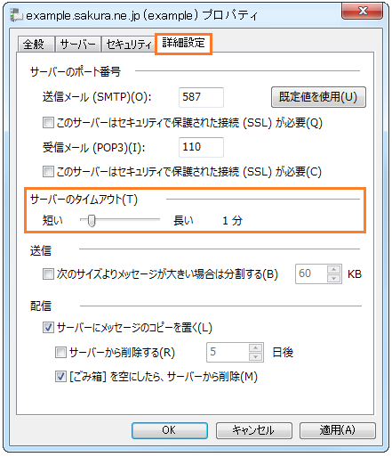 2「詳細設定」のタブをクリックし、サーバーのタイムアウト時間を長くします。