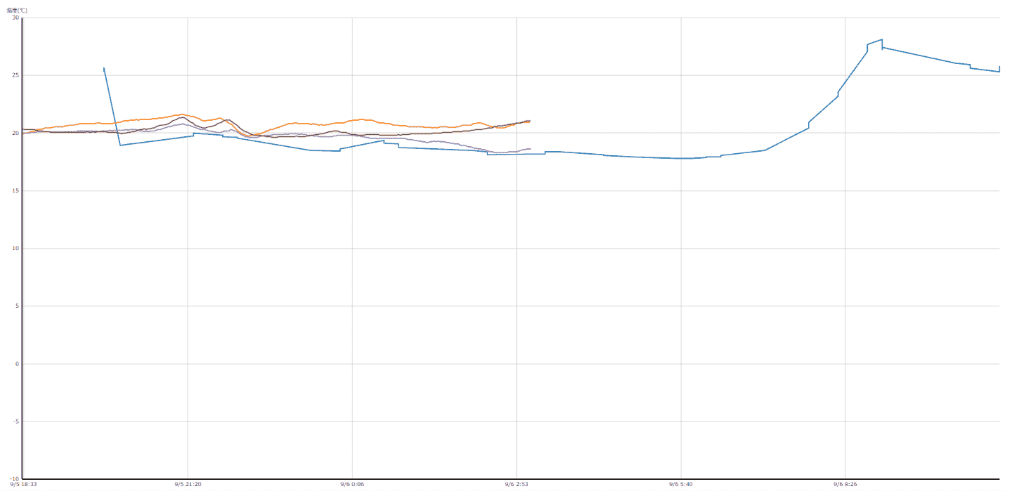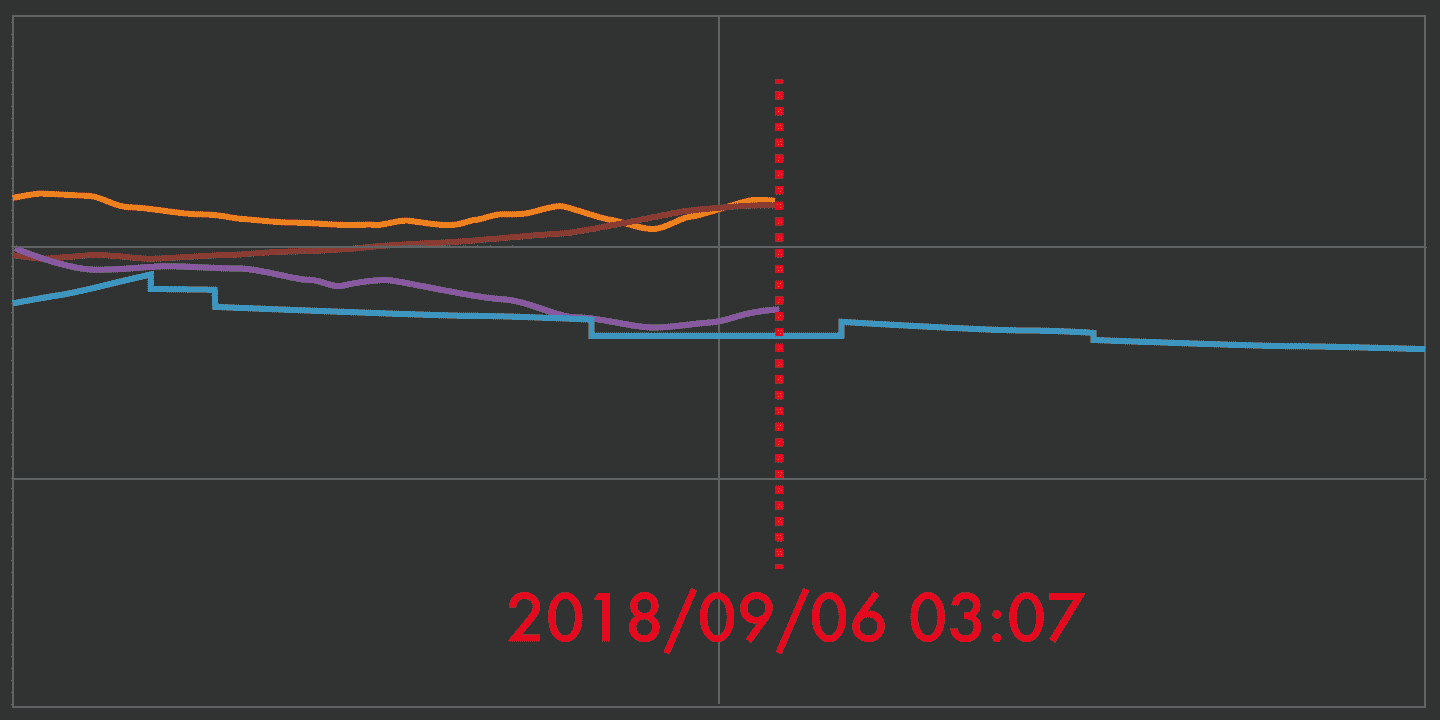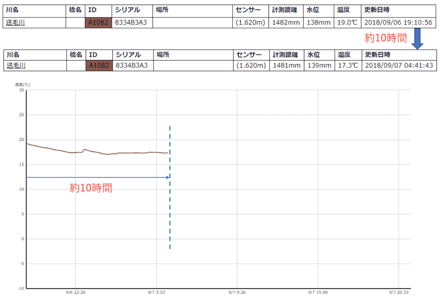 ついに9/8 AM1:21頃、復電の合図かの如く浜益に設置している水位センサから同時刻で一斉にデータが届きます。商用電源から給電しているゲートウェイからデータが中継されており、当該地域において復電したことが伺えます。