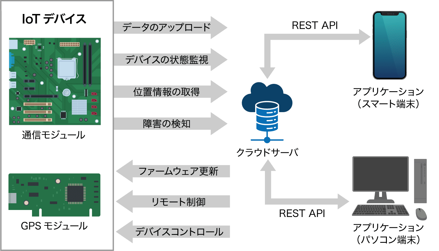 | クラウド・コンピューティング | API、PaaS、AWS IoT Core、Google Cloud IoT Core、Microsoft Azure IoT |