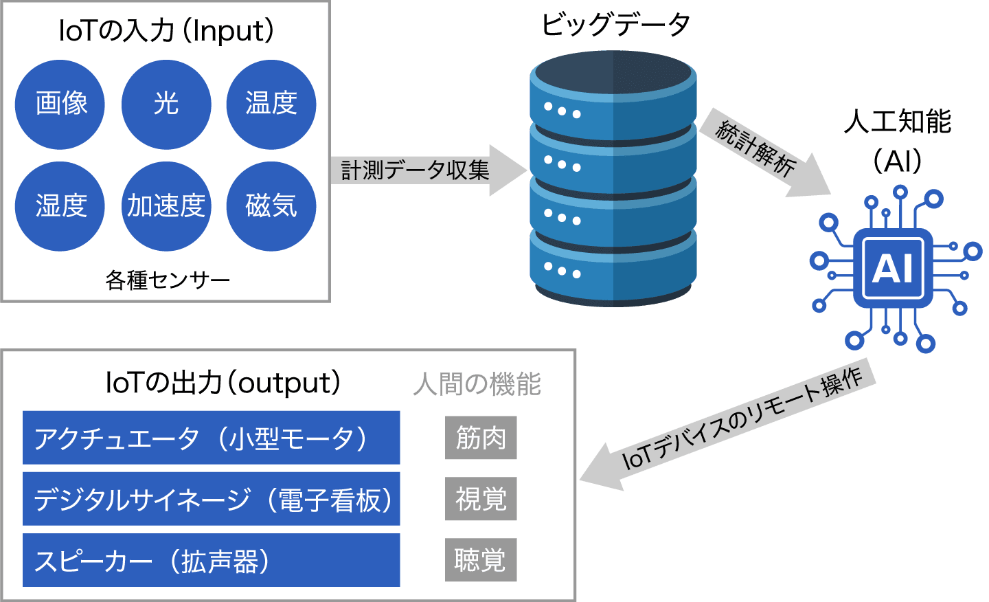 フィードバックでは入力(Input)の変化に応じて出力(Output)を最適化する制御を指します。入力の代表例は各種センサーで、出力では様々なものが存在し人間の機能に位置するようなニーズに応えるようなものになります。入出力の仲介役が人工知能(AI)になり制御する役目になります。AIがビッグデータの統計解析の結果にもとづいて、IoTデバイスの挙動を制御します。AIは機械学習や深層学習によって賢くなるので、ビックデータの蓄積に伴ってフィードバックの制御が向上していく特長があります。