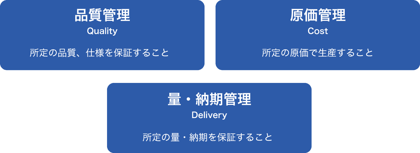 製造業における重要な3つの要素は、「QCD管理」「自社製品・サービスの付加価値向上」「新たなビジネス創出」です。工場の生産管理のQCD管理は、「所定の品質・仕様」(Quality)の製品を「所定のコスト」(Cost)で、「所定の数量・納期」(Delivery)どおりに生産できるよう生産活動を管理するという3つの要素が存在します。この一連の流れをQCD管理と言い、効率的に行うことが生産管理の目的で、3つの要素をバランスよく達成することが重要です。