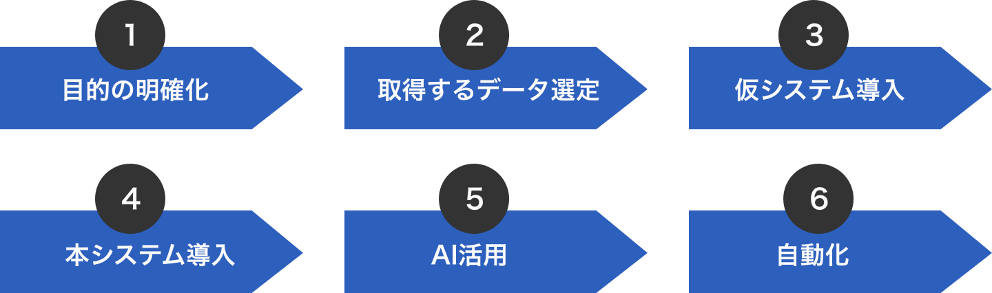 IoT化導入のステップは大きく分けると6つに分類できます。5と6は最先端の技術による、AI活用から自動化まで進む流れですが、一般的に人間が利用するまでは4のシステム導入まで考えれば良いでしょう。