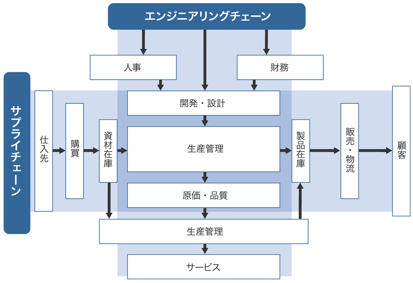 エンジニアリングチェーンを縦軸とサプライチェーン横軸のビジネスプロセスを図解して考えます。縦軸のエンジニアリングチェーンでは各工程でのデータを集約します。横軸のサプライチェーンでは経営や管理と工場の現場と仕入先から顧客ニーズの流れで集約しています。双方を連携して見える化することで、改善する課題が発見できます。