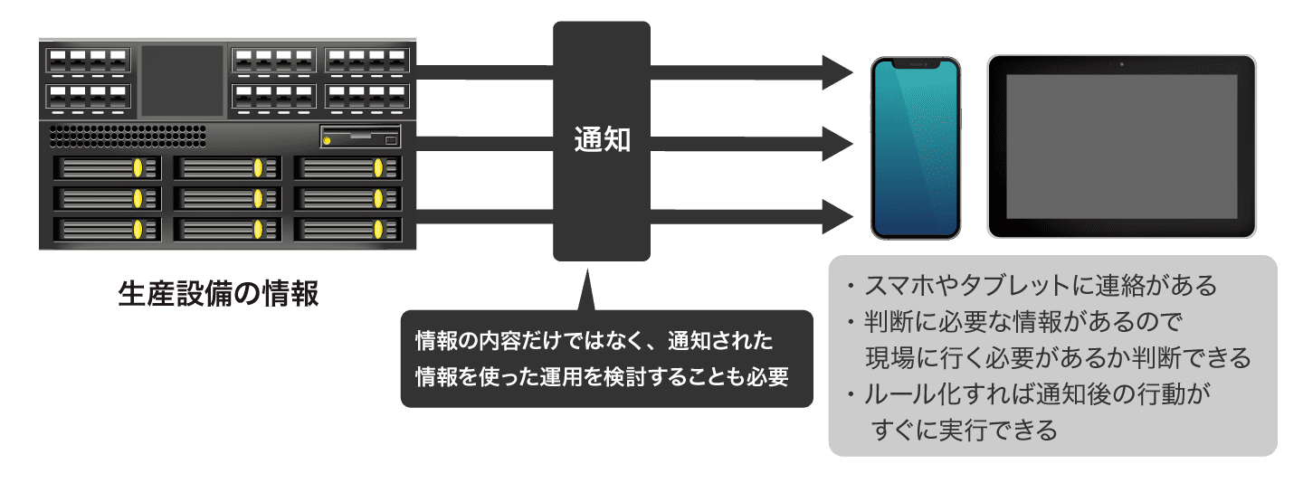 - 製造現場で異常が起こった際に速やかに対応するため、担当者のスマートフォンへ設備の警告情報をリアルタイムに届けるシステム
