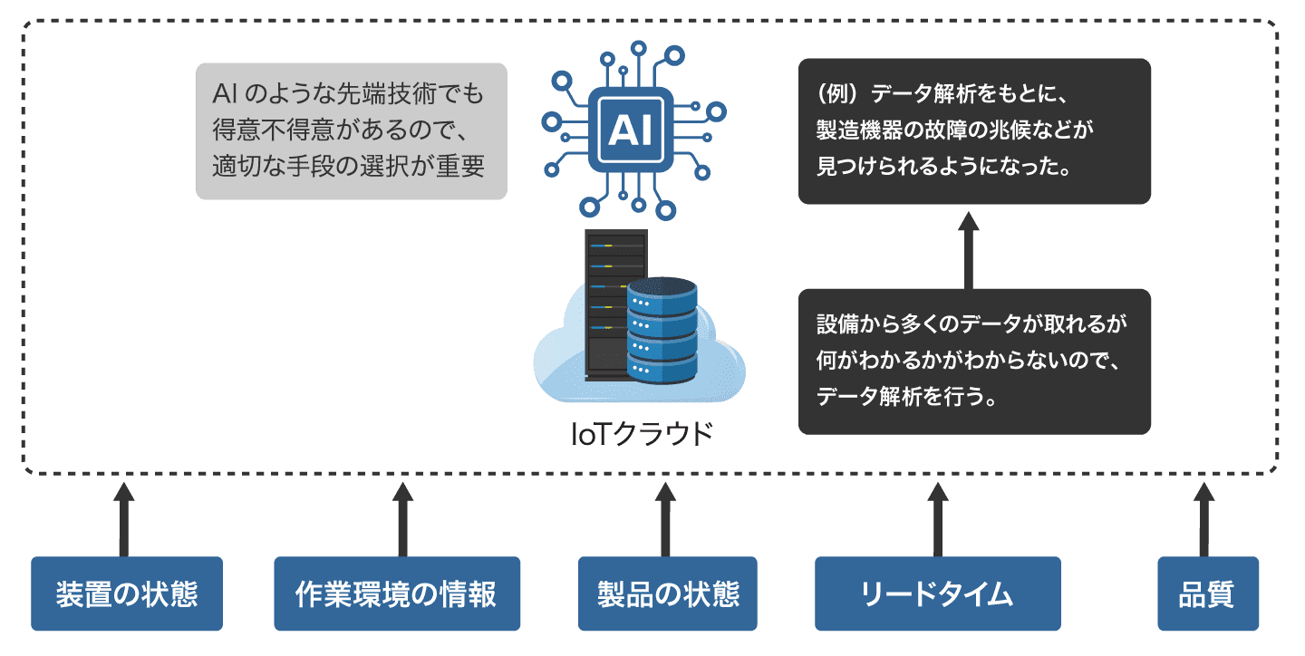 - 不良率や稼働率といった改善目標にたいし、関連が明確ではない大量データを収集し、どのデータをコントロールすれば目的を達成できるのか分析する。