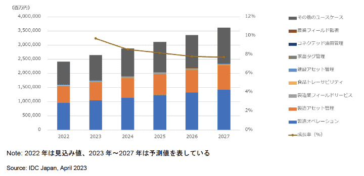 製造/資源セクターにおける支出額について、2022年の実績(見込み値)は2兆4,193億円であり、その後、2022年~2027年のCAGR 8.4%で成長し、2027年には3兆6,219億円に達すると予測しています。市場の成長とともに製造業のIoTは、これからも成長を続けていくことがわかります。