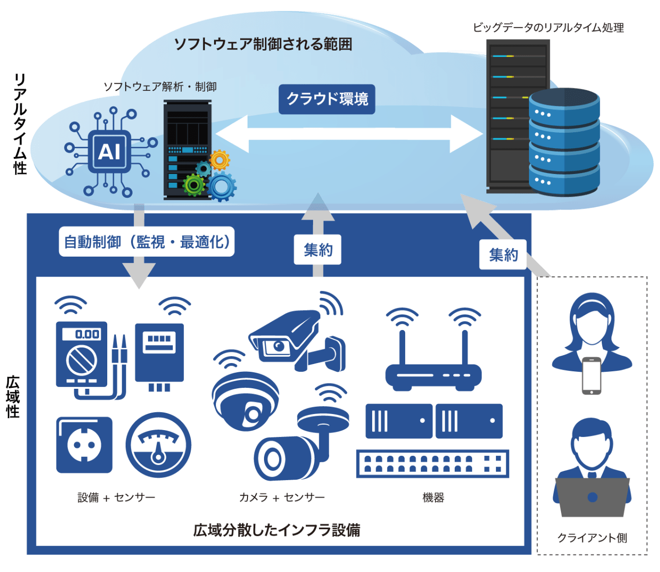 製造用IoTまたは俯瞰的な産業用IoTの本質は、リアルタイムで進行する事象に対してソフトウェアで自動制御することです。産業用IoTは「広域性×リアルタイム性」のニーズを満たさなければいならないため、どれも概ね同じ構成となっています。広域性とは、分散された設備・インフラに設置されたセンサーやカメラなどから様々なビッグデータを、広域ネットワークを介してクラウド上に集約する機能です。リアルタイム性とは、クラウド環境に吸い上げたビックデータをリアルタイムに処理し、自動で監視・最適化を実行する機能です。このようにIoTが製造業に与える影響は、最適化されたデータをもとに客観的に正確な評価ができることで、生産性向上につながることも利点です。