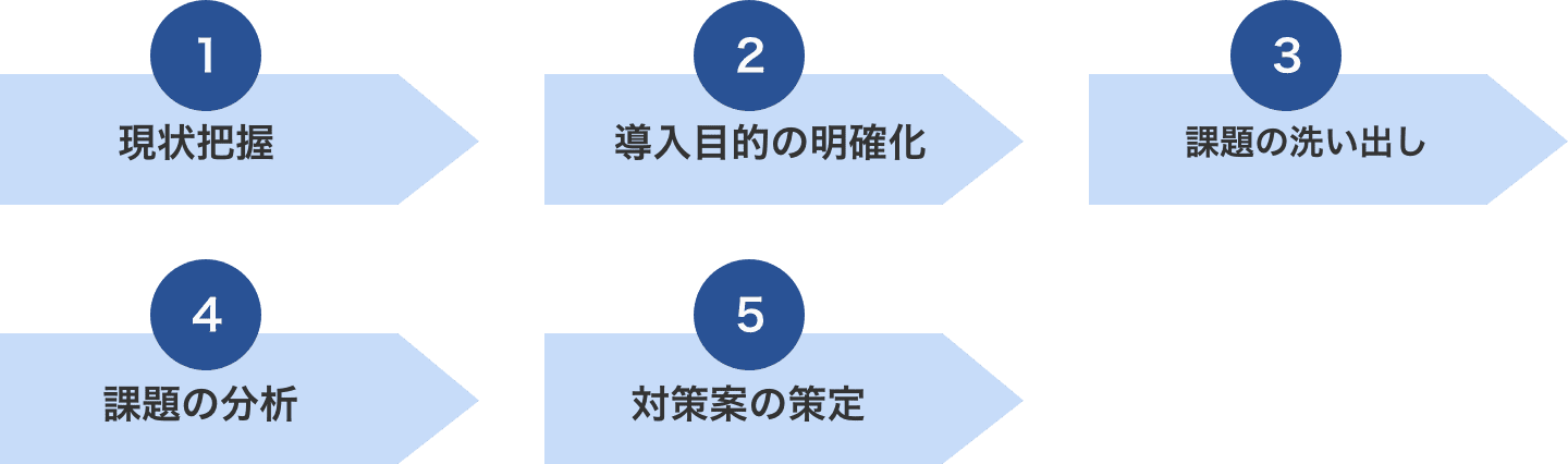 課題抽出項目は主に下の表で分類することができます。手順は現状の把握、導入目的の明確化、課題の洗い出し、課題の分析、対策案策定の流れで進めていきます。