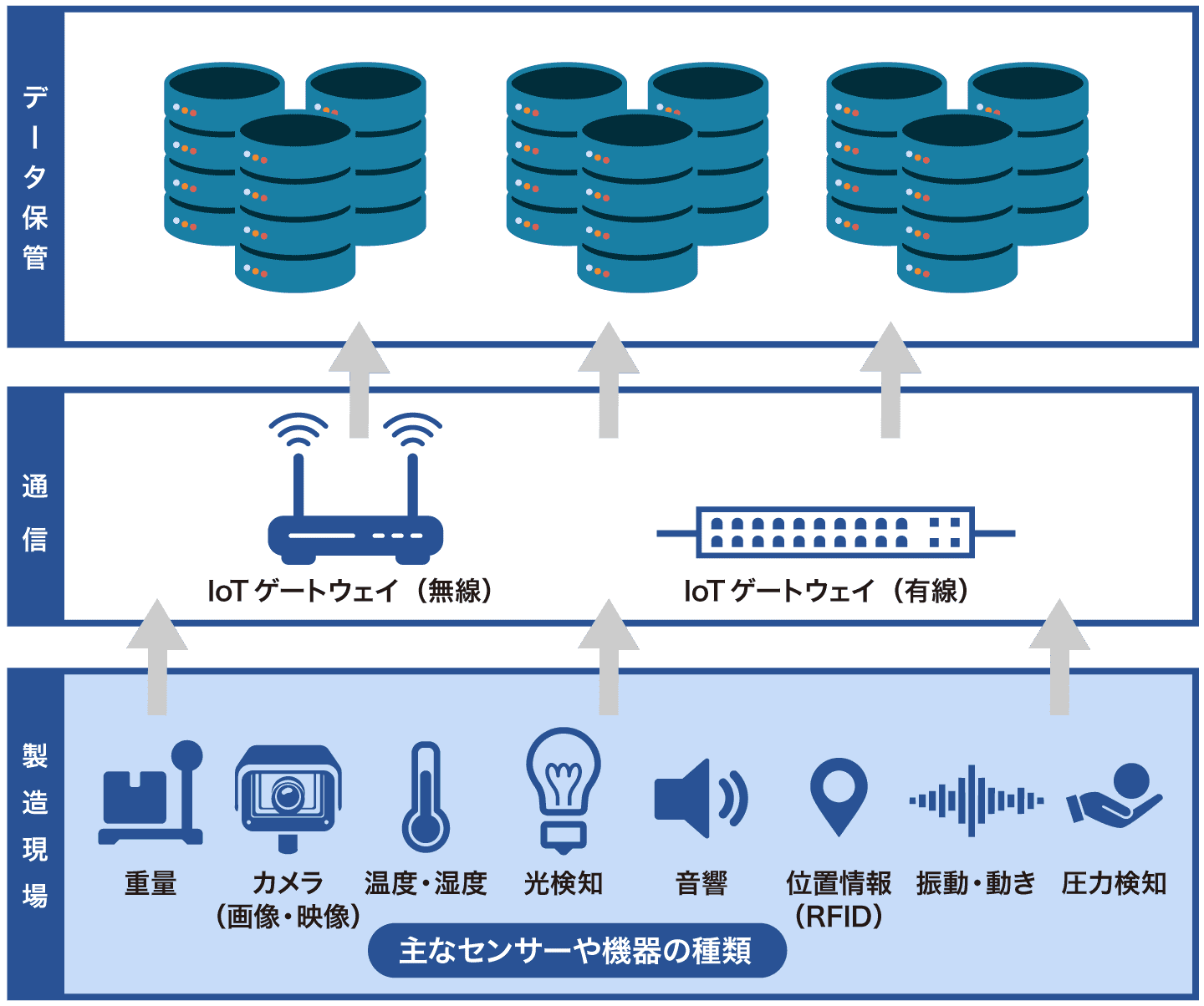 IoT製造装置とは、製造現場の設備や機器にIoTセンサーやカメラなどを搭載し、収集したデータをネットワークでクラウド環境に送り込むことです。代表的な例は、温度、湿度、振動、圧力などのデータ収集する「センサー」、画像や動画データを収集する「カメラ」、製品や資材にIDを付与し、追跡・管理するデータを収集する「RFID」、これらの収集したデータをネットワークに接続する「IoTゲートウェイ」です。