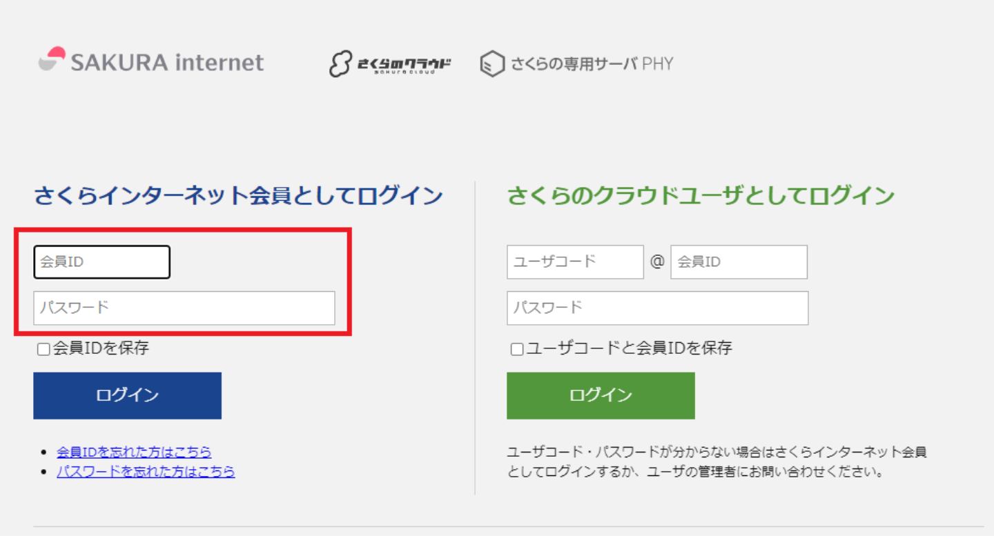 ①さくらのクラウドのコントロールパネルにアクセスし、お持ちの会員IDを使用してログインしてください。ログインが完了すると、さくらのクラウドのホーム画面に遷移します。