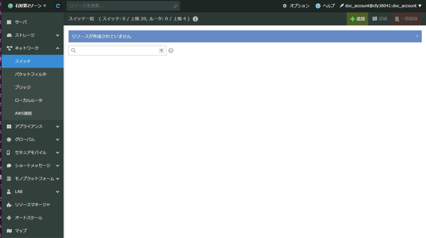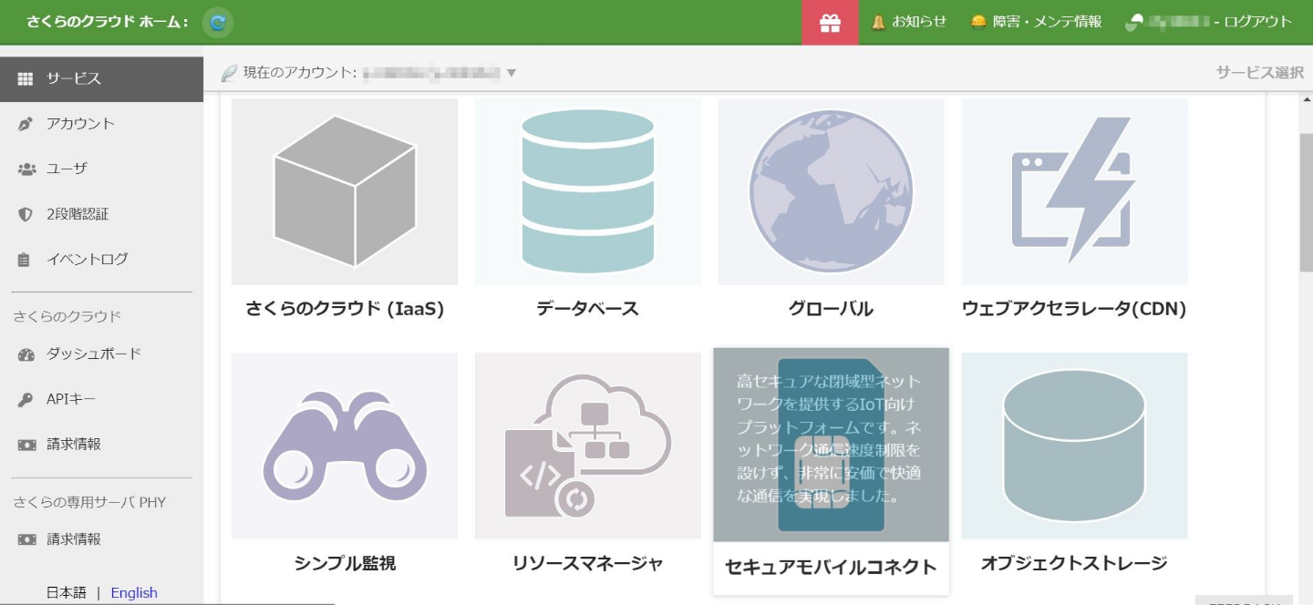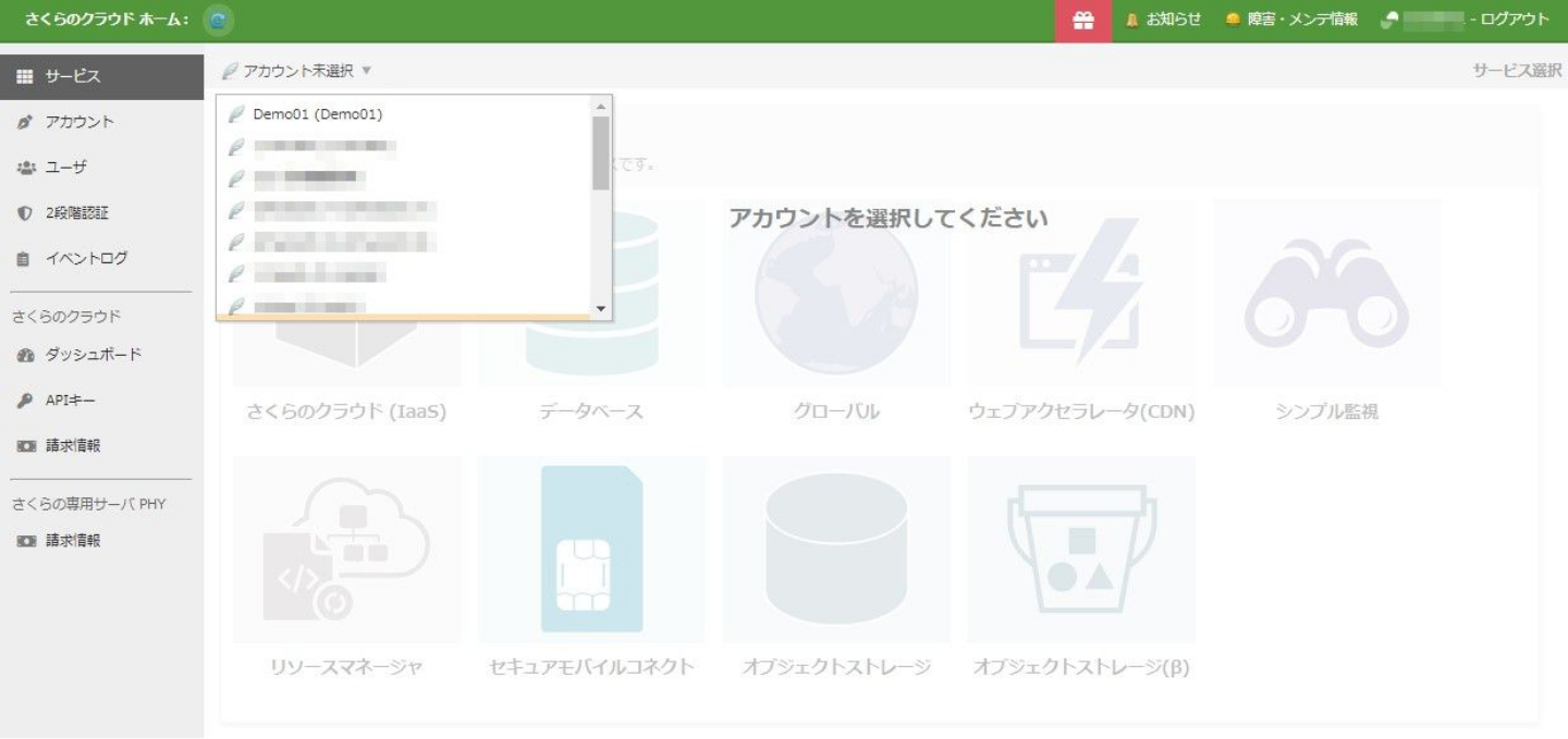 さくらのクラウドのコントロールパネルにログインした直後は、アカウントが未選択状態であるため、任意のアカウントを選択してください。このときアカウント未作成の場合は、アカウントを登録する必要があります。