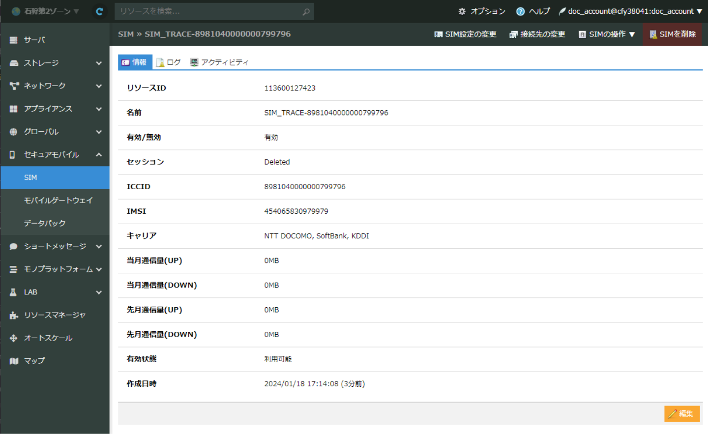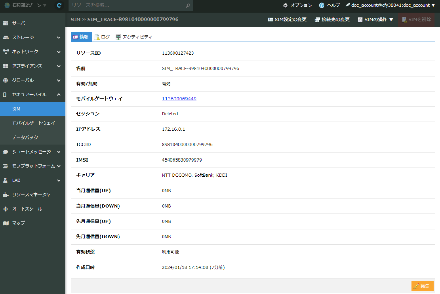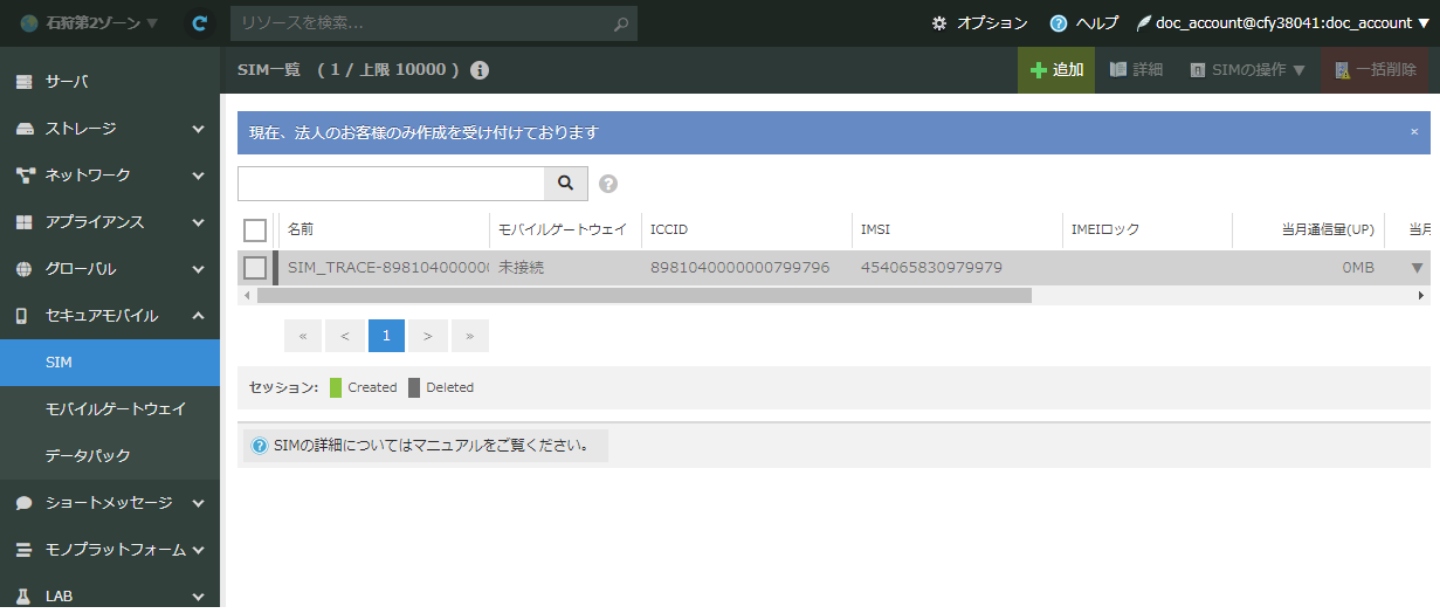 「SIM一覧」画面に作成したSIMが作成されていることを確認します。