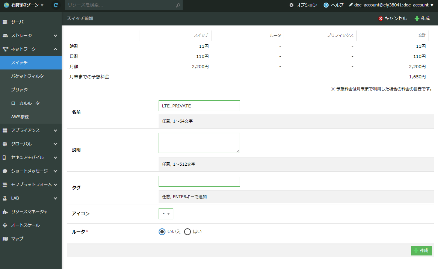 確認のうえ、問題がなければ「作成」をクリックすると、スイッチの作成が開始されます。