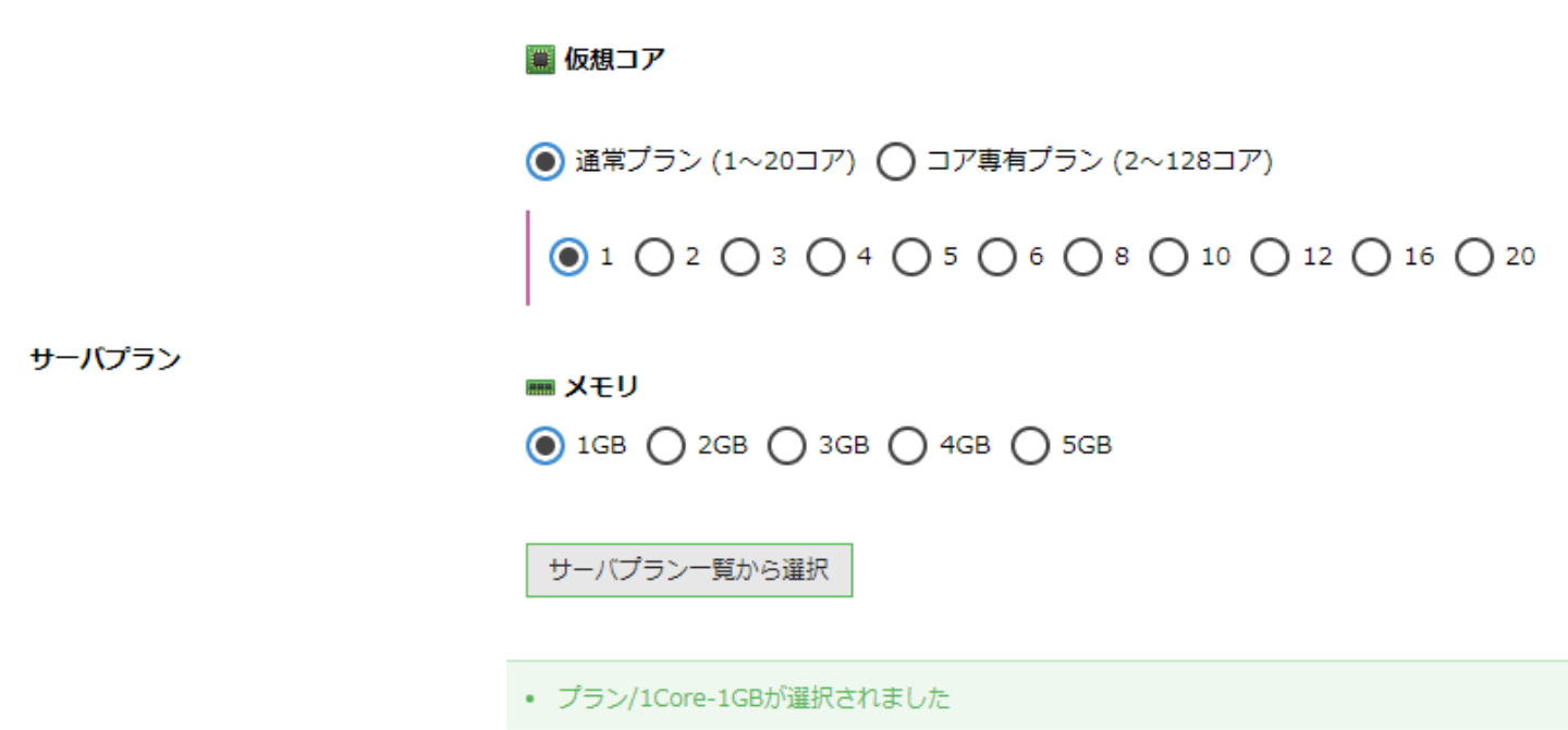 今回の用途では通信対向機としてのサーバは最小の構成でも十分ですので、通常プラン1コア、メモリ 1GBを選択します。