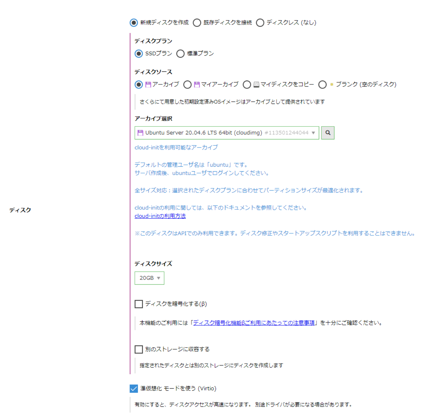 - アーカイブ選択:Ubuntu Server 20.04.6 LTS 64bit (cloudimg)