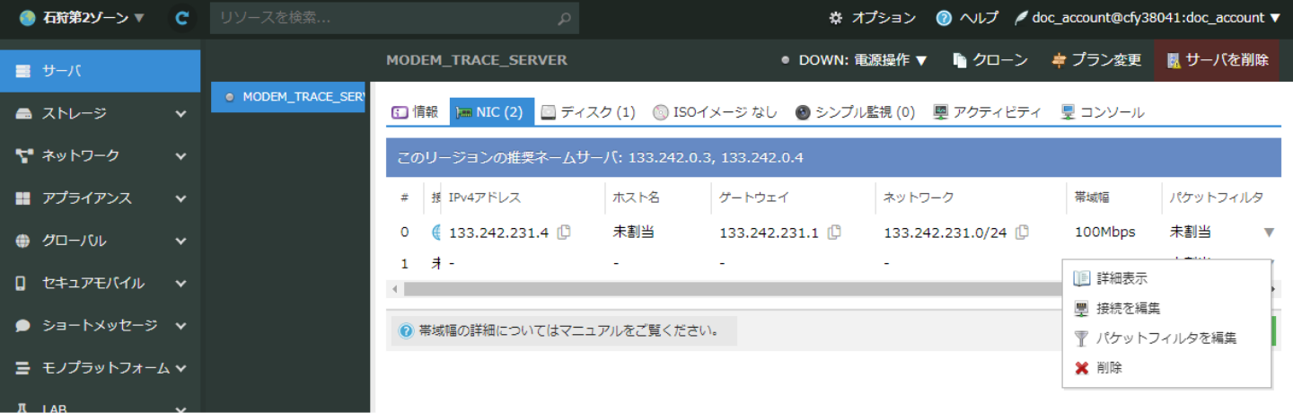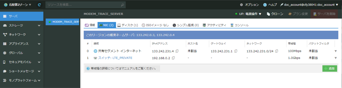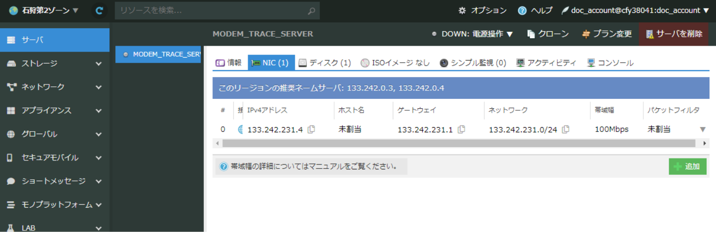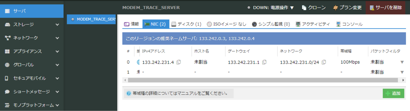 ①サーバ詳細画面のNICタブから、共有セグメント(インターネット)につながっている0番のNICのIPv4アドレスをコピーします。