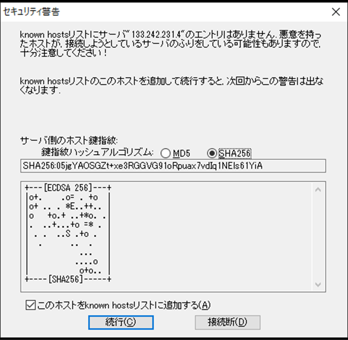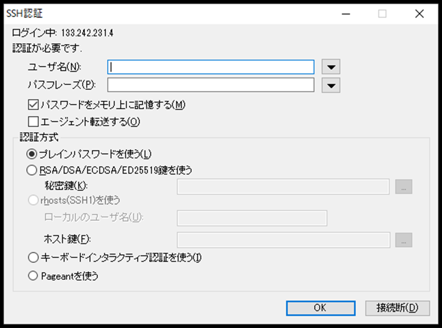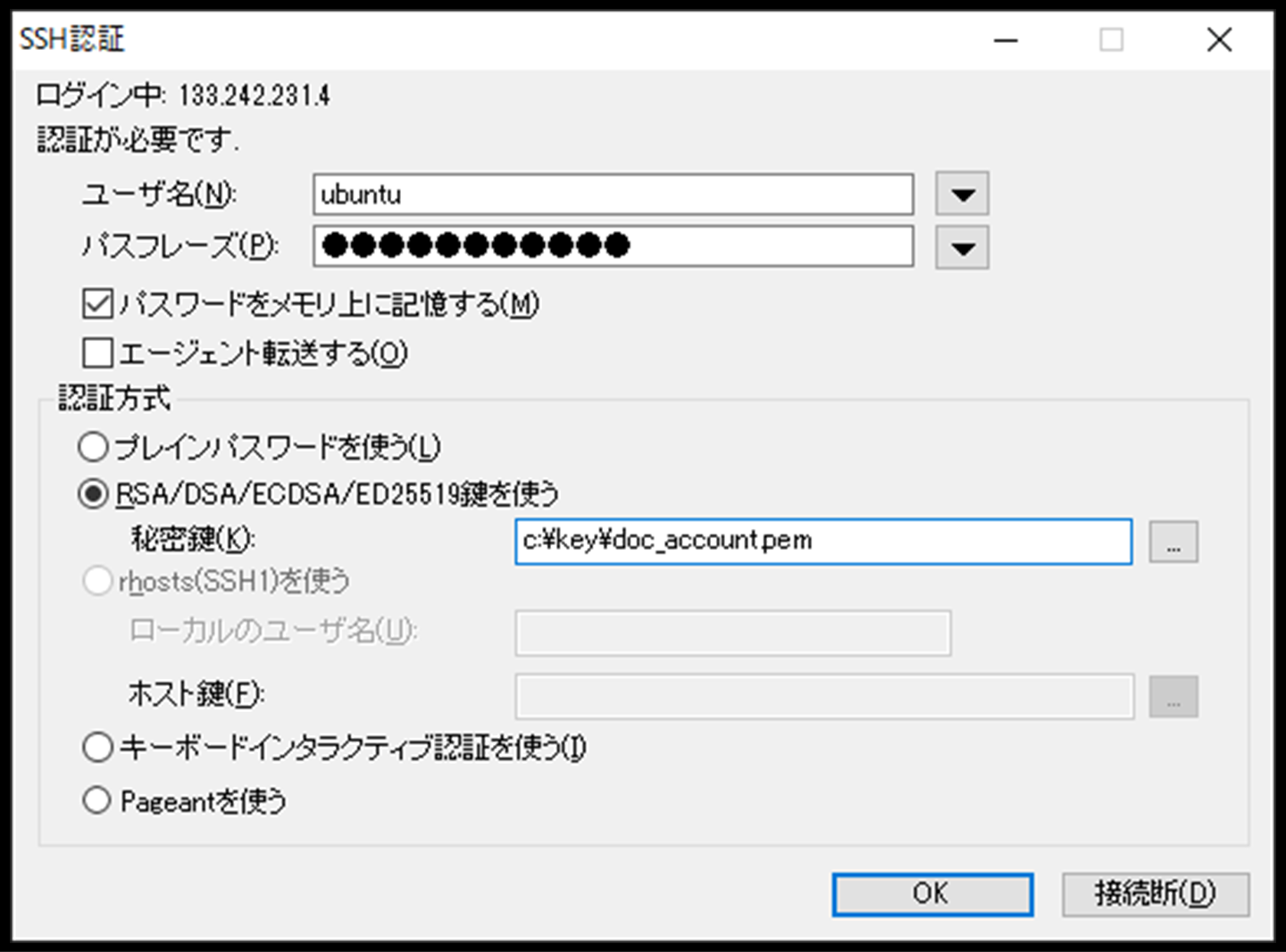 - パスフレーズ:公開鍵作成時に設定したパスフレーズ
