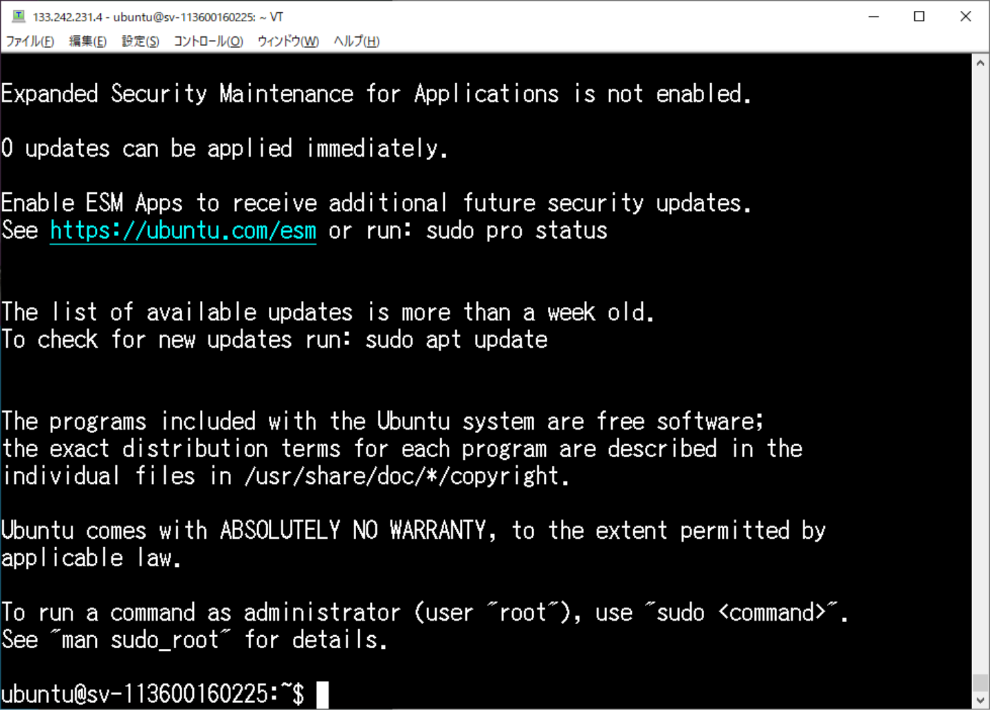 ubuntu@sv-113600160225:~$ sudo apt update ~~~~~~~~~~~~~~~ 31.5 MB を 11秒 で取得しました (2,956 kB/s) パッケージリストを読み込んでいます… 完了 依存関係ツリーを作成しています 状態情報を読み取っています… 完了 アップグレードできるパッケージが 91 個あります。表示するには ‘apt list —upgradable’ を実行してください。 ubuntu@sv-113600160225:~$ sudo apt upgrade ~~~~~~~~~~~~~~~ アップグレード: 91 個、新規インストール: 5 個、削除: 0 個、保留: 0 個。 60 standard LTS security updates 93.8 MB のアーカイブを取得する必要があります。 この操作後に追加で 178 MB のディスク容量が消費されます。 続行しますか? [Y/n] ~~~~~~~~~~~~~~~ done ubuntu@sv-113600160225:~$