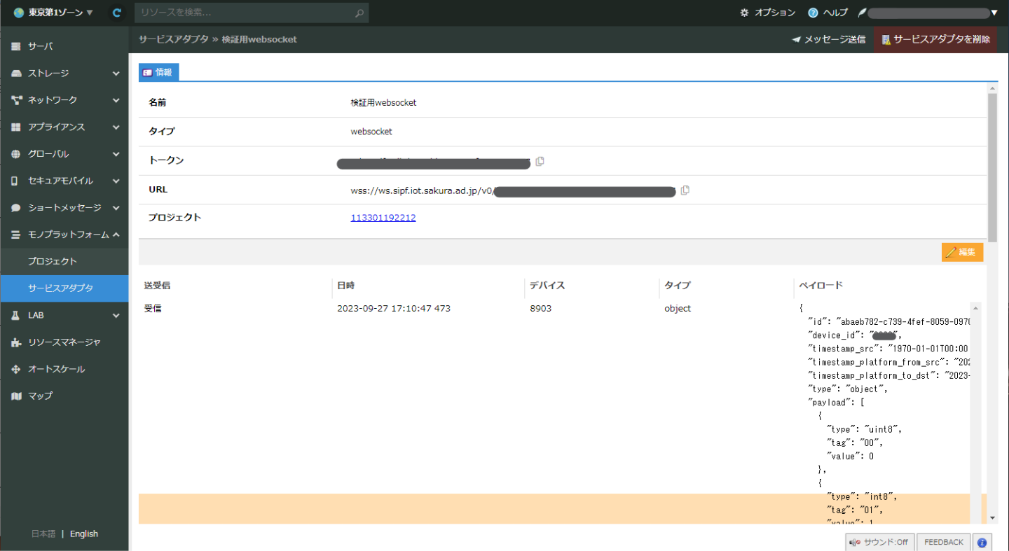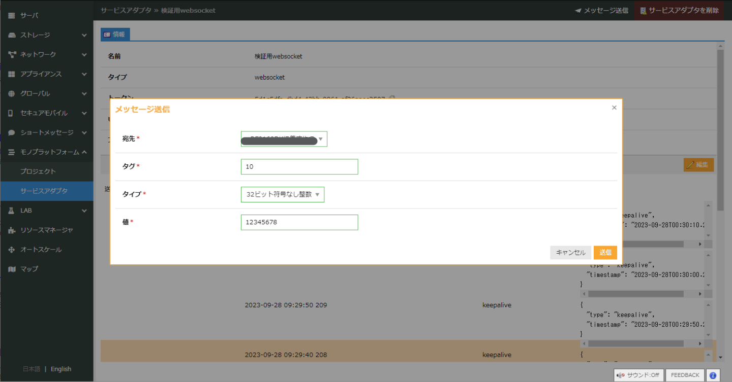 コントロールパネルのSIMが所属しているプロジェクトに関連付けられている「さくらのモノプラットフォーム」のサービスアダプタ(WebSocket)の画面の「メッセージ送信」からデバイスへ送信します。