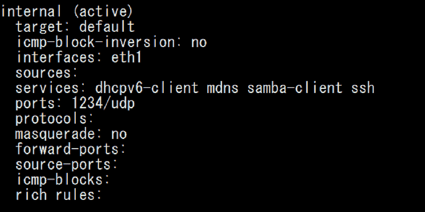 [root@localhost /]# firewall-cmd --zone=internal --remove-port=1234/udp --permanent - 設定反映:[root@localhost /]# firewall-cmd --reload