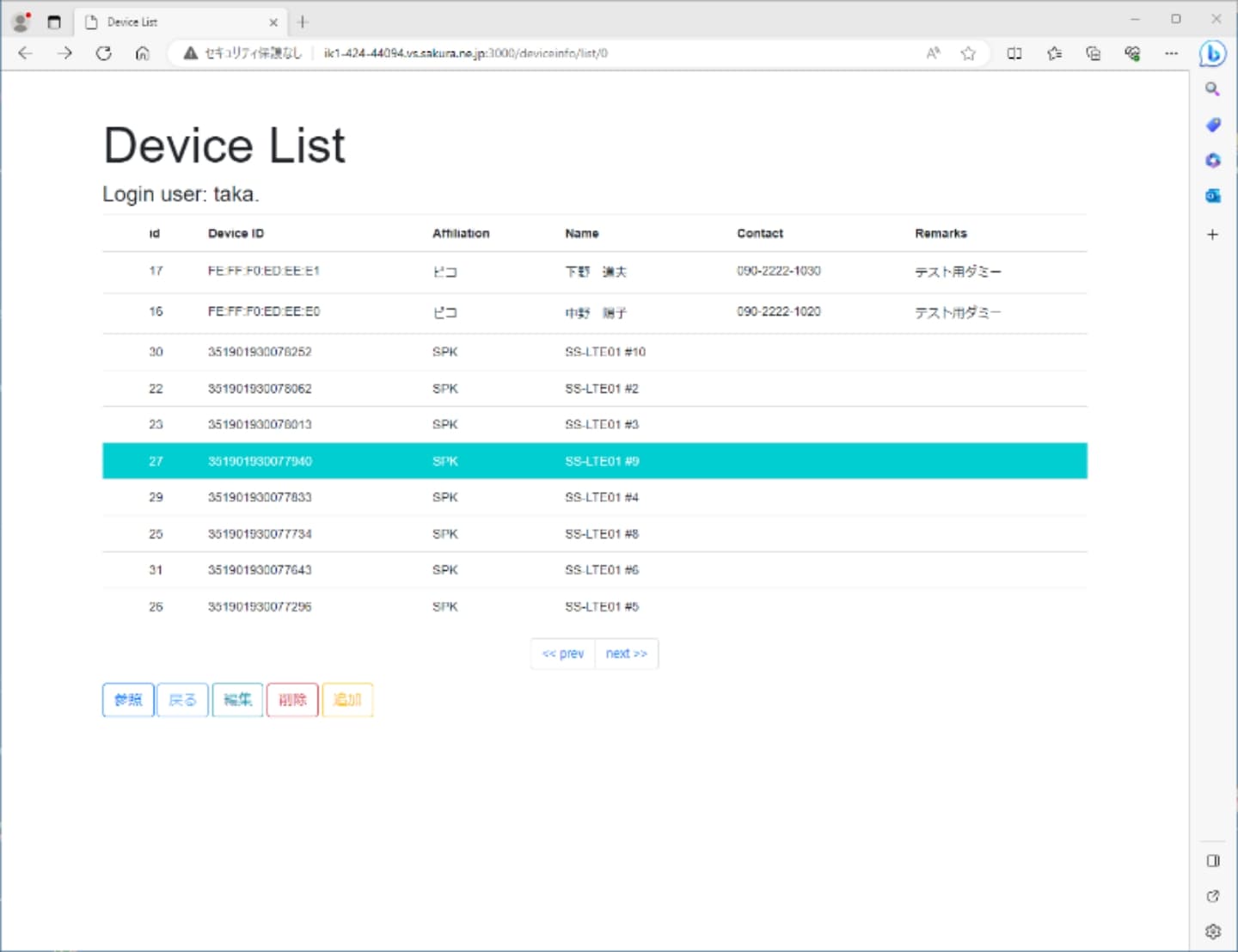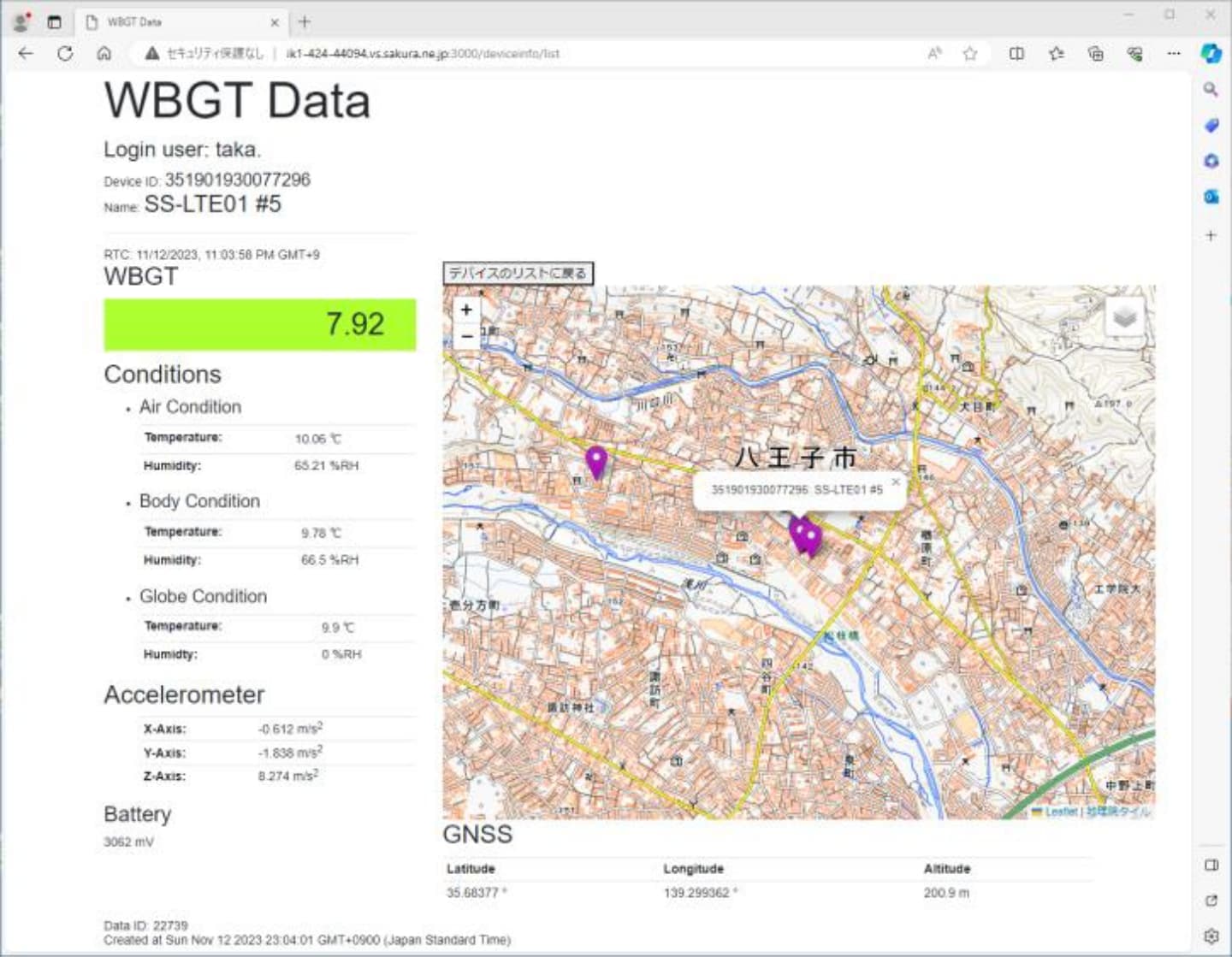 | 表示 | インターネットに接続されたPCでWebブラウザによりWBGT表示アプリにログインすることで、デバイスを選択し、そのデバイスの最新のデータを表示(位置情報は地図にプロット)し 、自動的に更新する。 |