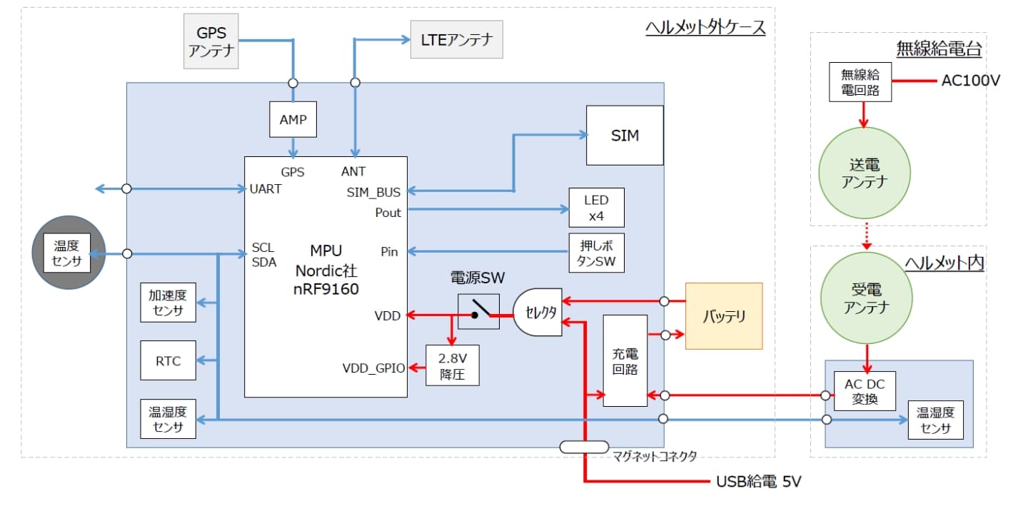 - ヘルメットへの装着を前提として、センサーユニットはできるだけ小型化し、バッテリ稼働とする