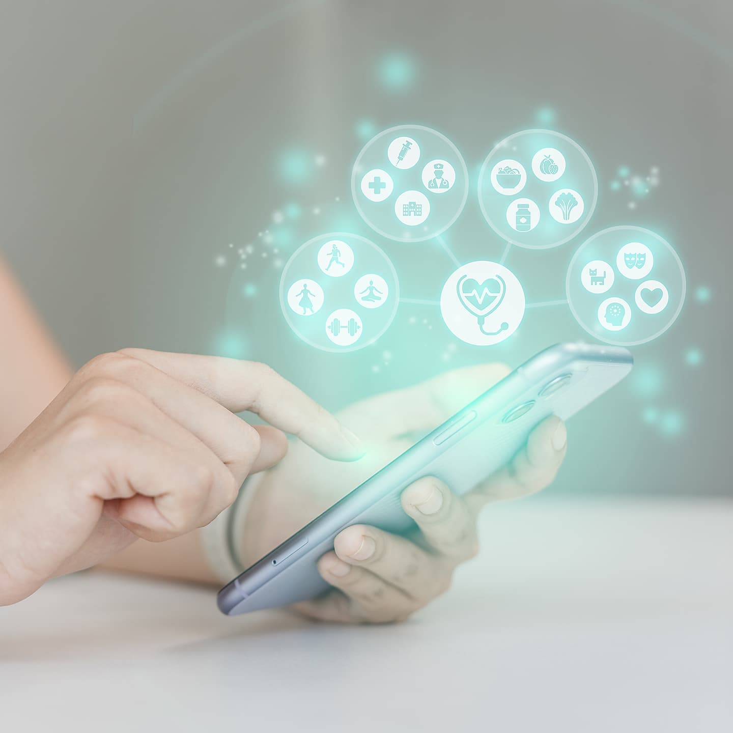 スマートヘルスとは、ICT(情報通信技術)を活用したヘルスケアのことであり、医療・福祉サービスの質の向上や、患者や利用者のQOL(生活の質)の向上を目指すものです。具体的にはウェアラブルデバイスや遠隔治療、AI(人工知能)を活用して、予防医療の促進、医療の効率化・高度化、患者の主体性の向上を目的にして取り組むことです。ヘルスケア(Healthcare:健康管理)とは、狭義の意味で医療や医薬分野の機器やサービスのことです。広義の意味では健康や体調管理といった医療行為以外の要素が含まれます。日本では少子高齢化が進行し超高齢化社会となり、高齢者の健康管理や医療、医薬に関する事業環境を中心に大きく変化しています。企業が取り組む「デジタルトランスフォーメーション(DX)」では、その先に存在するデジタライゼーションに取り組むと同時に、異業種のITプラットフォーマーとヘルスケア事業との関連性が深まっていくことも予測されます。また、新型コロナウイルス感染症の流行に伴い、人々の健康管理への関心が高まる中、ヘルスケア事業の役割は一層重要な存在になっています。