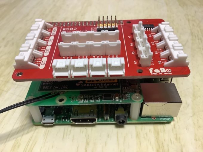 下から、Raspberry Pi、sakura.ioのHAT、FaBoのベースシールド