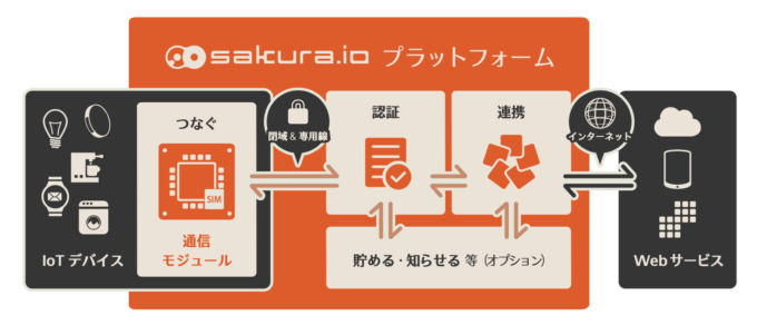 sakura.ioは、さくらインターネットが提供するIoTプラットフォームサービスです。IoTデバイスとの間はLTE(携帯電話の通信網)を使った閉域網(インターネットとの接続性のない閉じたネットワーク)で通信し、Raspberry Piなどの小型PCやマイコンを通してIoTデバイスとの間でデータを送受信します。一方、Webやアプリとの通信はSSLで暗号化し、WebSocketやWebhookなどのプロトコルを用いてデータを送受信します。このようにして、ともすると脆弱になりやすいIoTシステムをセキュアに、かつ組み込み系の人もWeb系の人も容易にシステムを構築できるのがsakura.ioの大きな特徴です。