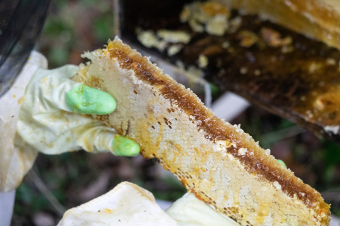 上大田:一番、困るのは複数の巣箱でとれるタイミングがすべて同じになることなんですよ。採蜜の作業って、蜜のついた巣を洗濯ネットみたいなやつに入れて、ひたすらポタポタ落ちてくるのを待つんです。だからめちゃくちゃ時間がかかるし、ポリタンクもそんなにいっぱいありません。