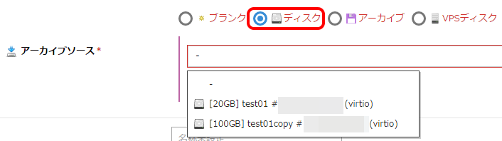 ※さくらのクラウド ホーム画面に「さくらインターネット会員としてログイン」した際に、同一会員IDに「さくらのVPS」の契約がある場合にのみ、VPSディスクが表示され選択可能です。