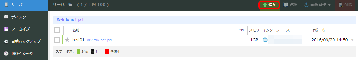 それでは実際にアーカイブからサーバを作成してみましょう。アーカイブは前回作成した「test01_archive」を使用します。