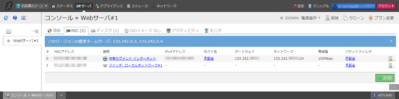 今回新規に作成したサーバと共に2台のサーバが表示され、いずれもステータスが「DOWN」(電源が落とされている状態)となっています。まずは前回までに作成した「Webサーバ#1」のNICをスイッチに接続するため、ダブルクリックして詳細画面を表示します。詳細画面上部の「NIC」タブをクリックすると、サーバに取り付けられているNICの一覧が表示されます。前回NICを1枚追加したので、2枚のNICが見えています。