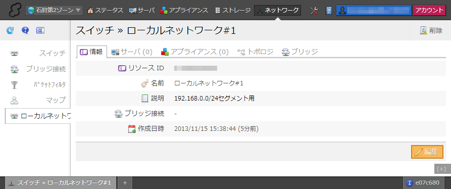まずは今回新たに使用するリソース「スイッチ」を作成します。「スイッチ」は仮想化されたEthernetスイッチで、仮想サーバ側のEthernetインタフェースを複数接続し、それぞれのサーバを相互に通信させることが可能となります。