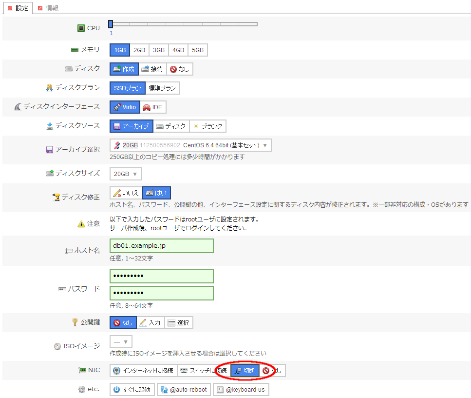 サーバ作成時の設定項目は「第3回 サーバを作ってみよう」で解説したものと同様ですが、グローバル側のネットワークには接続しないので、「NIC」の設定項目は「切断」(サーバにNICの取り付けはするがどのネットワークにも接続しない)を選択しておきます。