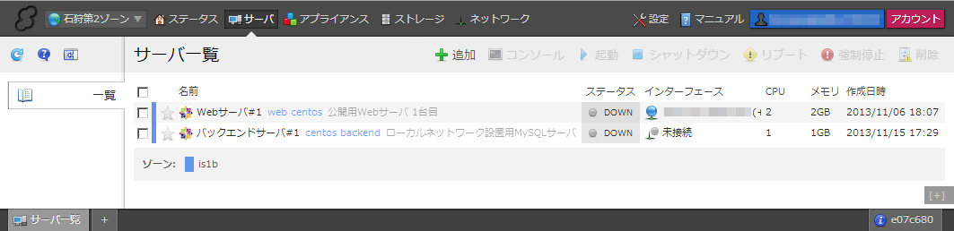 となります。さくらのクラウドでは、スイッチに接続したいサーバの詳細画面側から、対象NICをいずれかのスイッチに接続する、という操作となります。まずはサーバ一覧画面を表示します。