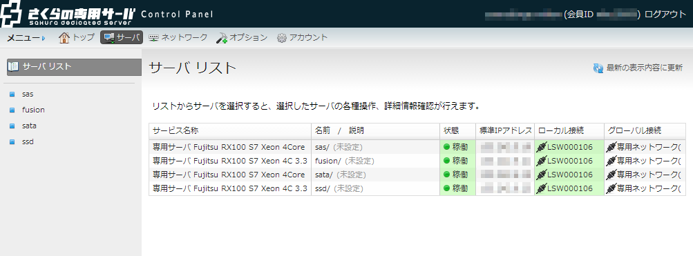 また、さくらの専用サーバでは契約している複数のサーバーをローカルネットワーク内で接続する「ローカル接続」機能や、専用のグローバル接続ネットワークを利用できる「専用グローバルネットワーク」オプションサービスが提供されており、接続するローカルネットワークやグローバルネットワークの切り替え操作もこの画面で実行できる。