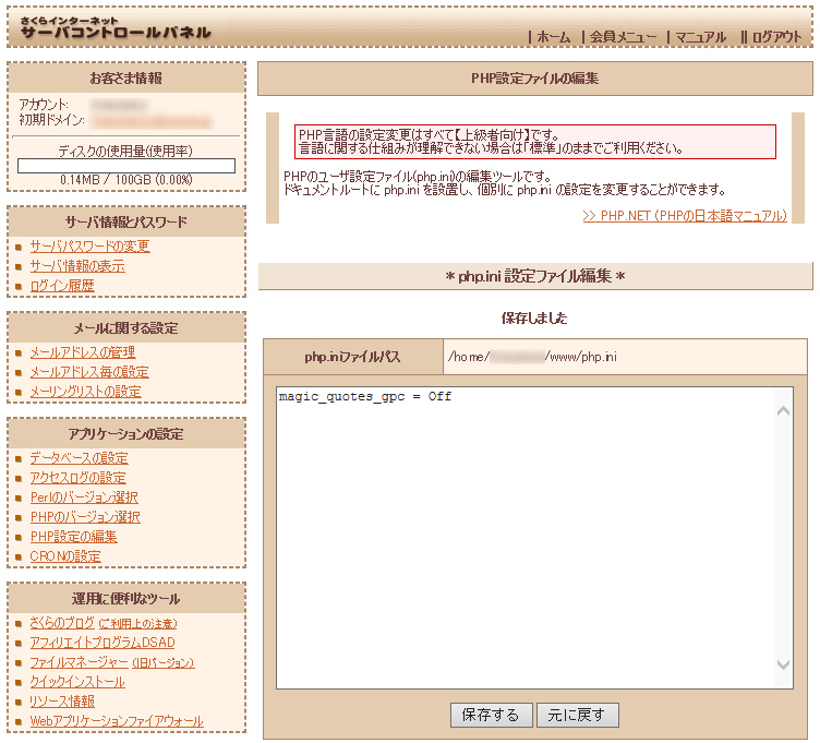 そこで再び、さくらの「サーバコントロールパネル」にアクセスし、「php.ini設定ファイルの編集」というところで「magic_quotes_gpc = Off」と設定しました。