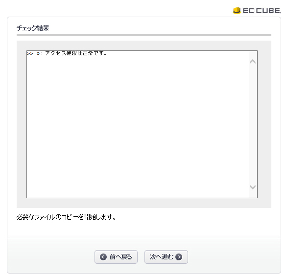 再びEC-CUBEのインストール画面に戻り、進めていくと、チェック結果に「アクセス権限は正常です」と表示されました。ほっ。