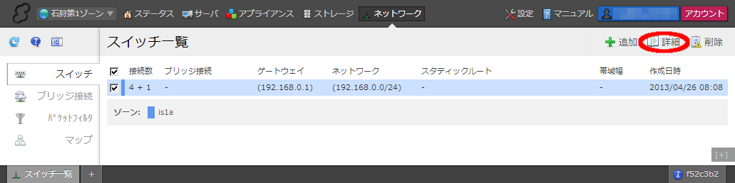 上部のメインメニューで「ネットワーク」を選択し、左側のサブメニューで「スイッチ」を選択します。作成済みのスイッチ一覧が表示されるので、ブリッジを接続したいスイッチを選択し、左上の「詳細」ボタンをクリックします。