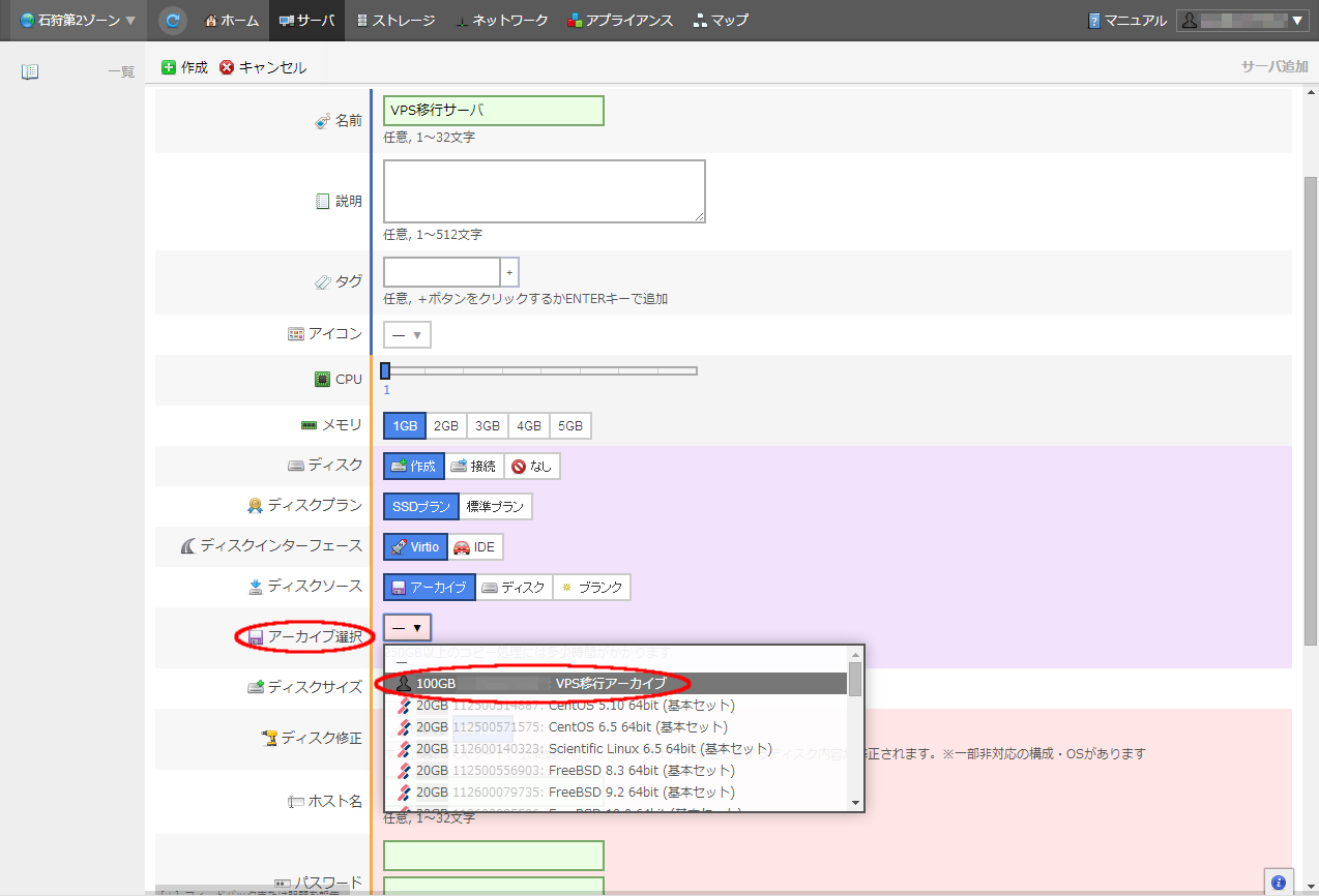 VPSから移行したディスクイメージはアーカイブに保存されるため、サーバ作成時はこのアーカイブをソースとして作成します。アーカイブとディスクの詳細については連載第8回「 アーカイブ・ISOイメージ機能を活用してみよう 」を参照してください。