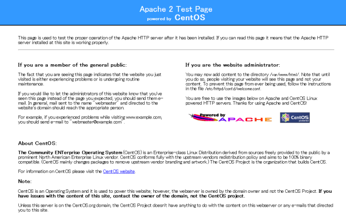 最初にウェブサーバーの Apache をインストールします。yum で CentOS のレポジトリからインストールします。