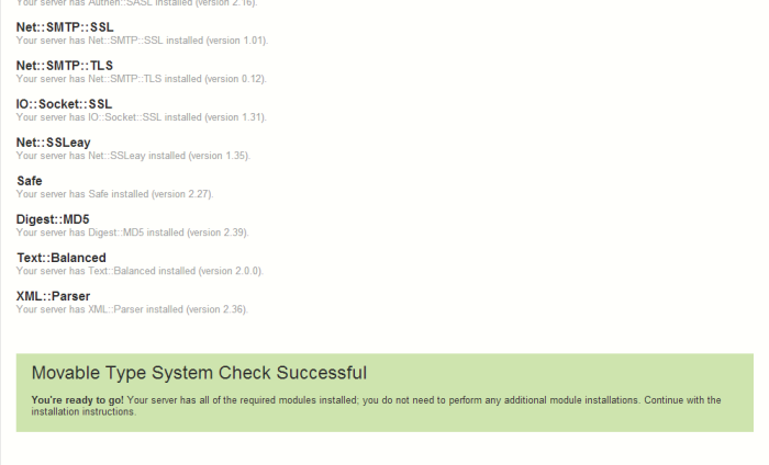モジュールのインストールができたら、再度 mt-check.cgi をチェックしてみましょう。