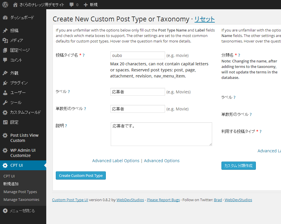 まず、応募フォームからの応募内容を受け入れるためのカスタム投稿タイプを設定します。カスタム投稿タイプは、Custom Post Type UIプラグインを使うと簡単に設定することができます。