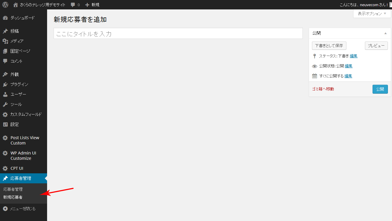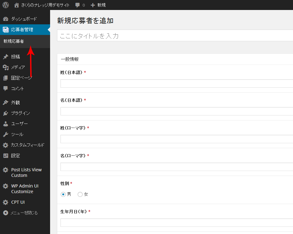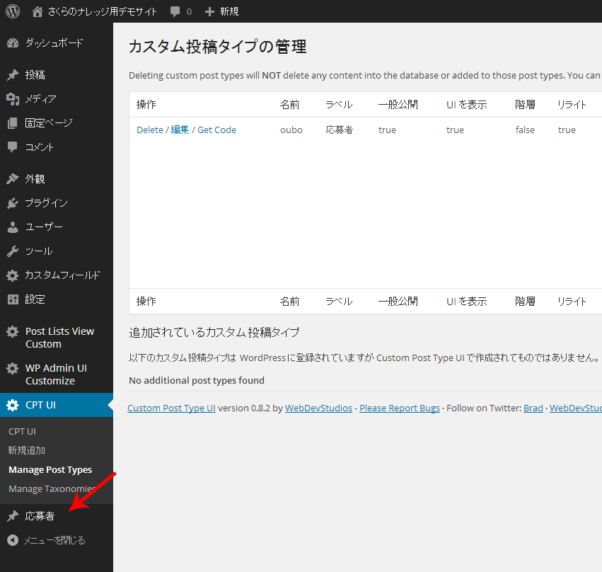 「Create Custom Post Type」ボタンを押すと、左のメニューの最後の方に、応募者という項目が追加されているのがわかると思います。