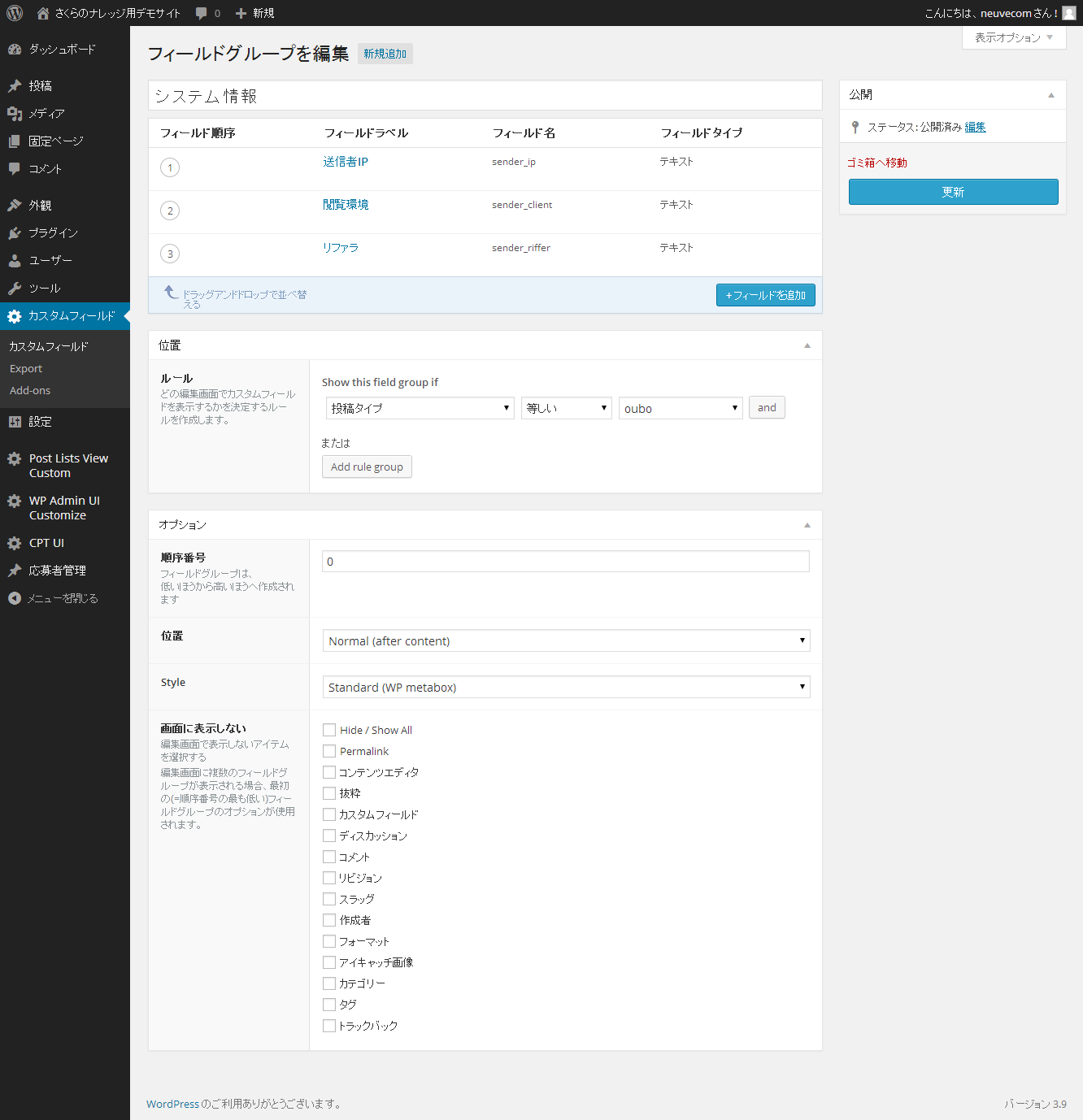 上記は、システム情報として、IPアドレスなど3つのフィールドを設定したところです。Advanced Custom Fieldsは設定のインポート/エクスポートができますので、一度に全部設定せずに、あらかじめいくつかのグループで分けて設定するといいでしょう。管理画面での表示もわかりやすくなります。