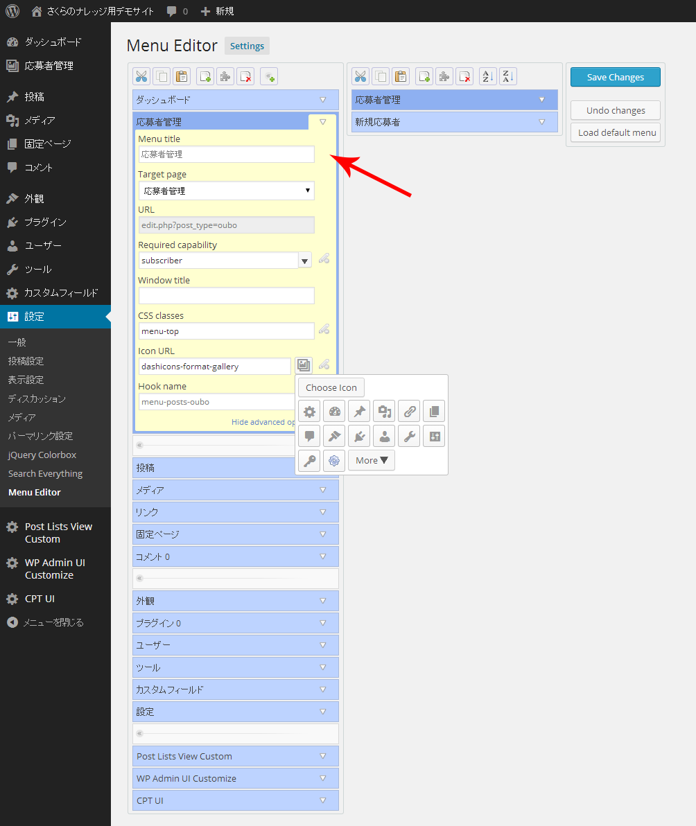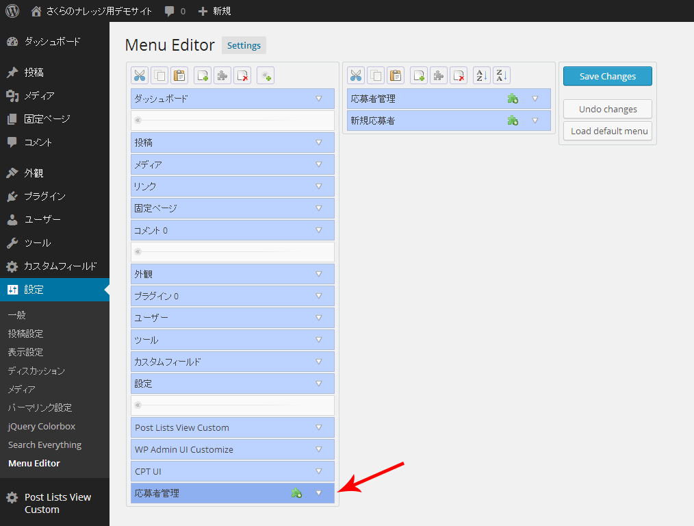 次に、設定した応募者管理の項目はメニューの下の方にあり、使いづらい状況ですので、この位置を変更します。この変更は、Admin Menu Editorプラグインを利用して行います。実はこの設定は、先ほどのCustom Post Type UIプラグインでも可能なのですが、Admin Menu Editorプラグインの方がわかりやすい画面で設定できるので、こちらを使います。