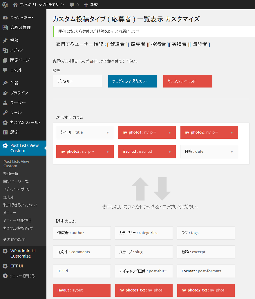 そこで、Post Lists View Customプラグインを使うことにより、管理画面を見やすくカスタマイズすることができます。下図はPost Lists View Customプラグインの設定画面です。