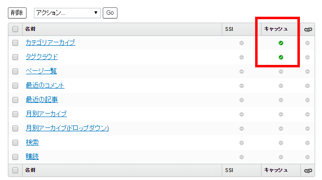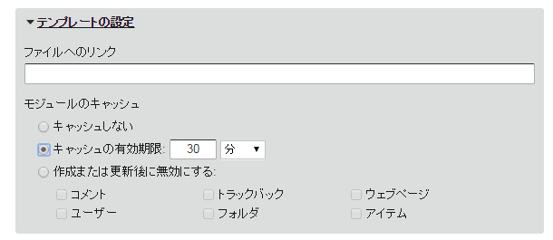 テンプレートモジュールの管理画面を見ると、キャッシュが設定されていることが分かります。